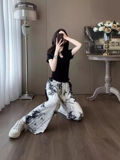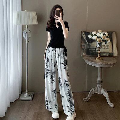 2024 楽ちんセットアップ 春夏秋 半袖 スポーツカジュアルスーツ国風シフォンワイドパンツ洋風2点セット ルームウェア スウェット上下セット スーツ レディース