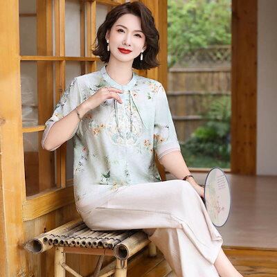 2024 楽ちんセットアップ 春夏秋 お母さんの春夏秋服綿麻スーツ新中式老女性の春夏秋の半袖国風シャツ2枚セット ルームウェア スウェット上下セット スーツ レディース