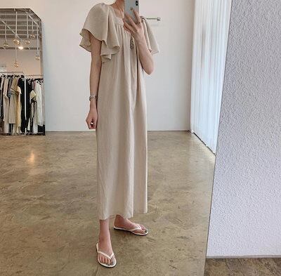 韓国/スクエアネック/鎖骨見せ/ロング丈/万能/気質/ワンピース/コットンスカート カップ 付きインナー