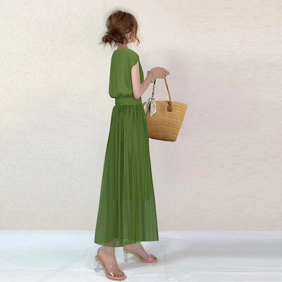 夏/新作/気質/Vネック/薄手/タイ/ウエストゴム/ドレス/カップ 付きインナー