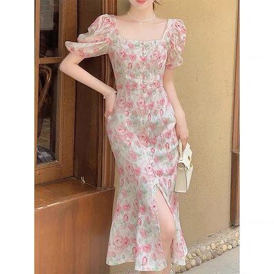 【お勧め商品】 ピンク花柄ワンピース 半袖 スリット フリル スクエア襟 ロングワンピース 夏 着痩せ レディース ワンピース 「W.D」 メガ割