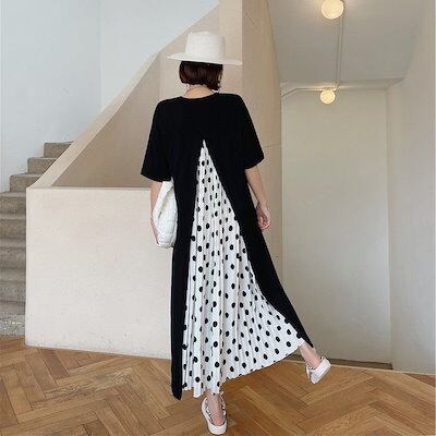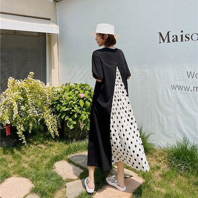 夏 新作 Tシャツ ワンピース 半袖 ワンピース ラウンドネック 色切り替え 水玉模様 シフォン ワンピース 大きいサイズ ロング ゆったり 着やせ 体型カバー