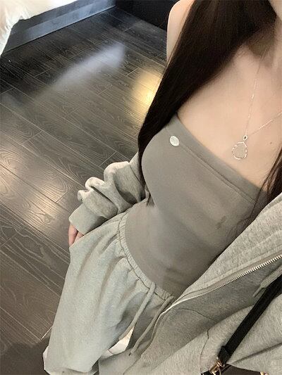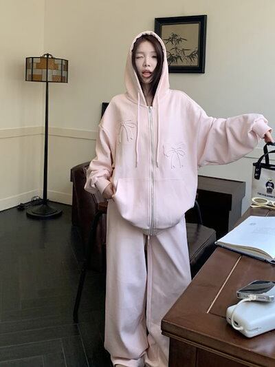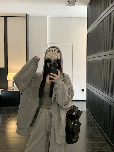 2024 秋冬 韓国 3点セット かわいい レディース フード付きアウター_白フーディー ブルゾン長袖ショート丈トップスグレー冬カジュアルファッション系お出かけフル丈トラック高校生 通学大学生 | Jeannede ジャンヌデ