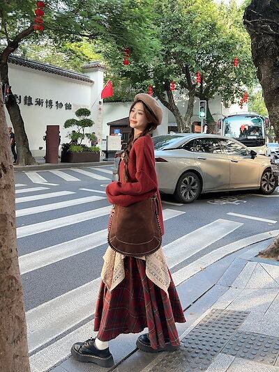 2024秋冬セットアップ カーディガン クマちゃん ロングスカート 不規則 チェックスカート ルーズ 長袖 レトロ 韓国ファッション レディース 大人可愛い ガーリー