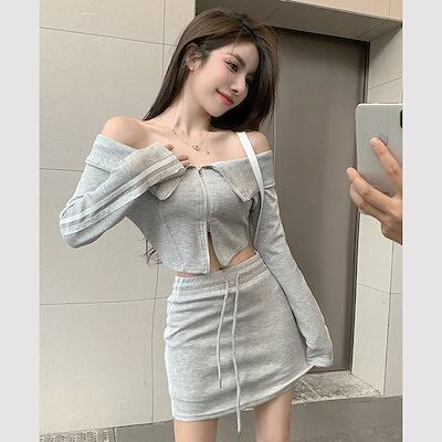 2024 秋冬 2点セット 2wayトップス スカート長袖 かわいいラウンドネックTシャツレディース韓国風ルーズゆったり無地 カジュアルサイズおしゃれファッション系サイドフルパーカーお出かけダブル