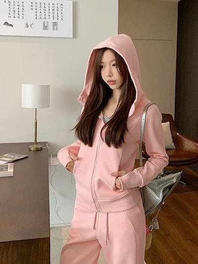 6色 今年 秋冬 韓国 2点セット かわいい レディース フード付きアウター_白フーディー ブルゾン長袖ショート丈トップスグレー冬カジュアルファッション系お出かけフル丈トラック高校生 通学大学生