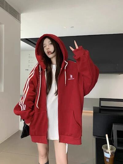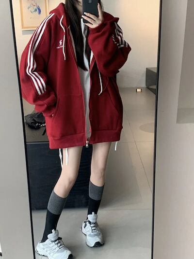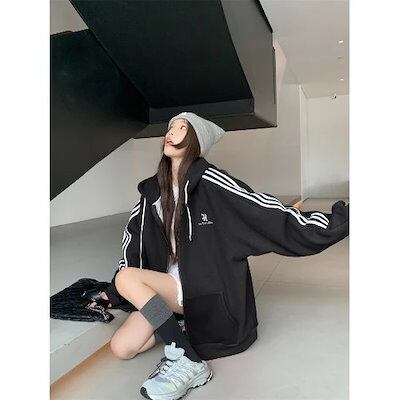 2024 秋冬トップス パーカー 裹起毛 2type フード付き チャック長袖ストライプゆったり細見え白黒おしゃれかわいいガーリーキュート 甘め 韓国ファッション レディースサイドお出かけトラック