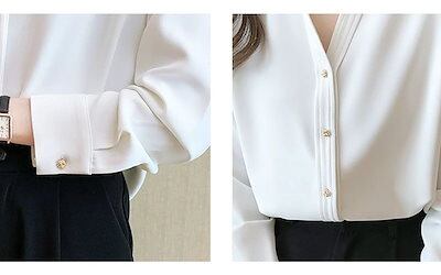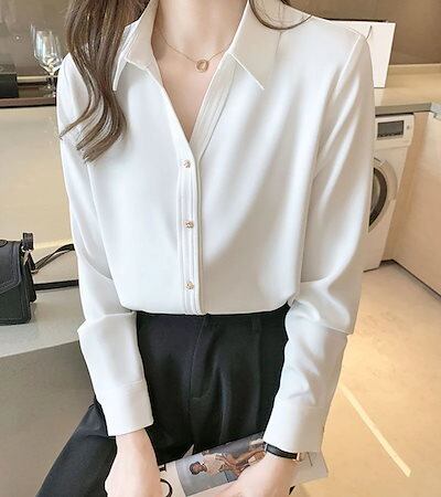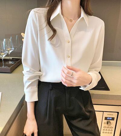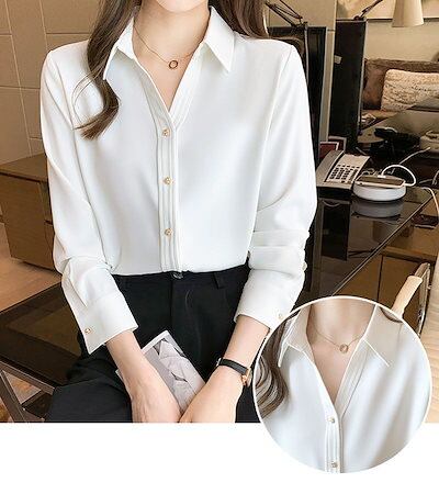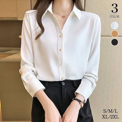 ゴールドボタンサテンシフォンブラウスシャツトップス長袖レディースおしゃれ流行可愛いカジュアル大人可愛いゆったり無地ブラック黒ホワイト白ブラウン