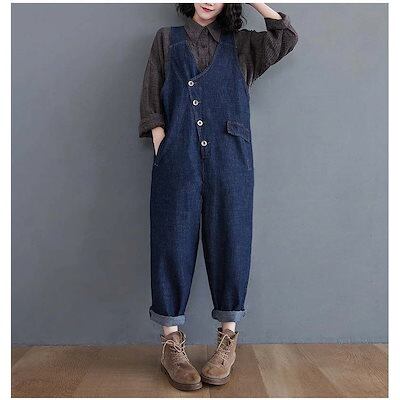 サロペットパンツレディースデニムパンツデニムサロペットVネックオールインワンデニムロン