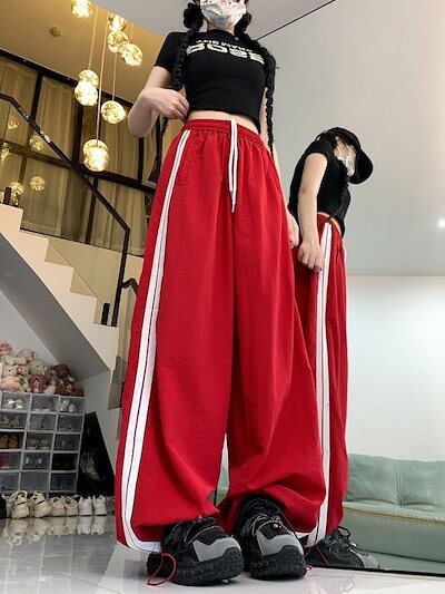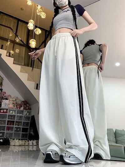 2024 夏 韓国パンツ ロング丈 ウエストゴム ストライプ ワイド ストレート ハイウエスト 美脚効果 脚長効果 細見え 夏 白 黒 赤 おしゃれ かわいい 韓国ファッション レディース お出かけ