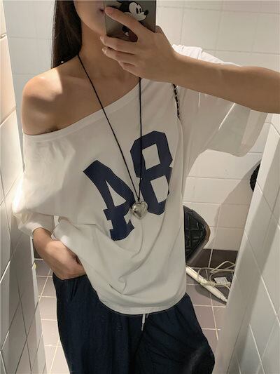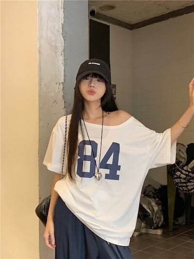 2024 春夏トップス Tシャツ 半袖 数字 84 オフショルダー 肩見せ ゆったり 細見え 夏 白 ホワイト おしゃれ かわいい シンプル 韓国ファッション レディース お出かけ