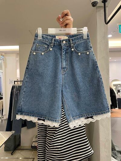 2024 春夏パンツ ハーフパンツ デニム ジーンズ ワイド レース リボン ハイウエスト 美脚効果 脚長効果 細見え 夏 おしゃれ かわいい 韓国ファッション レディース お出かけ