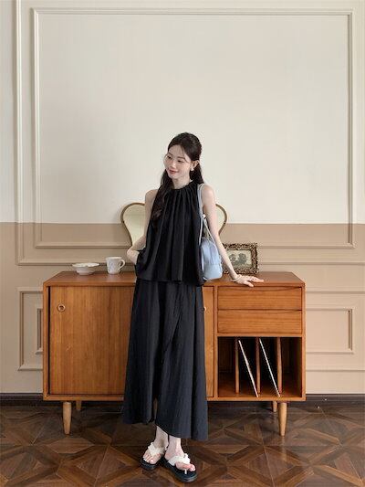 2024夏 韓国セットアップ シャツ ホルターネック ノースリーブ スカート ロング丈 Aライン ゆったり 細見え 夏 青 黒 きれいめ おしゃれ かわいい 韓国ファッション レディース お出かけ
