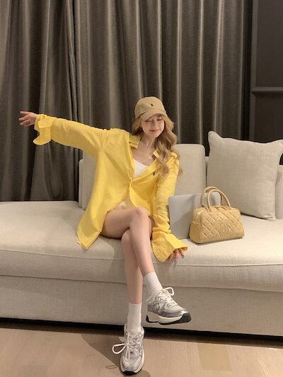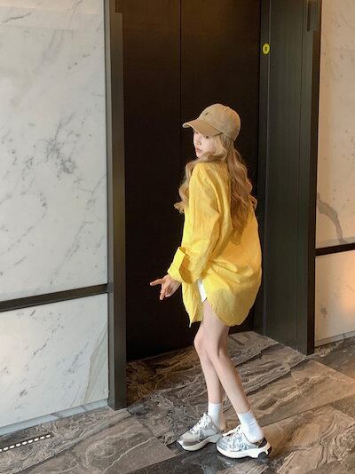 2024春夏トップス シャツ ボタン 襟 長袖 ゆったり 丈長め 細見え 夏 黄色 イエロー カジュアル おしゃれ かわいい シンプル 韓国ファッション レディース お出かけ