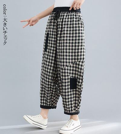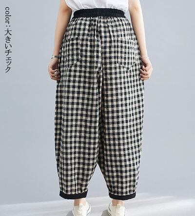体型カバー 大きいサイズ 春夏 春 美脚 ウエストゴム ガウチョウ シルエット リラックス ワイドパンツ レディース サルエルパンツ リネン混 チェック柄 9分丈 パンツ ゆったり バルーンパンツ イ