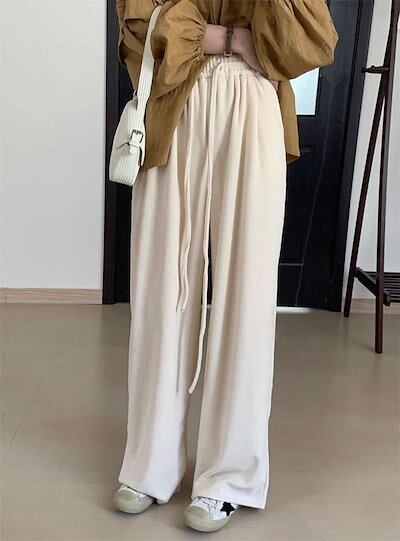 冬 秋冬 ゆったり ロング丈 着?せ ワイドパンツ 無地 春 ギャザー ストレートパンツ ズボン ニットパンツ 暖かい ボトムス シンプル ウエストゴム ポケット付 ロングパンツ レディース コットン