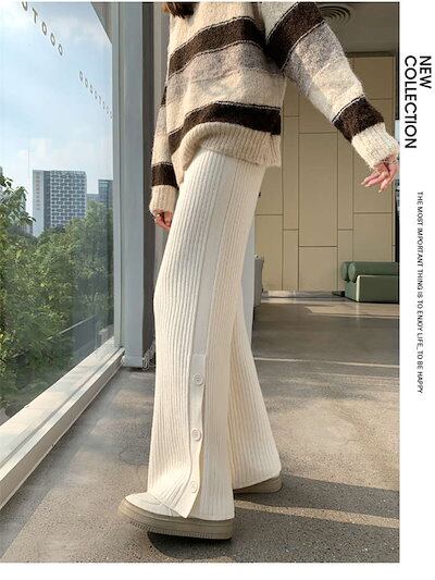 ハイウエスト フレア パンツ ワイドパンツ フレアパンツ ワイド 無地 レディース ゴム ボトムス サイドスリット ニットパンツ ワンマイルウェア きれいめ ガウチョパンツ リブニット ゆったり ロン
