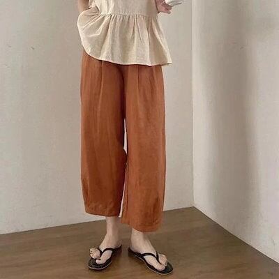 レディースセミワイドタック入りカジュアルゆったりワイドパンツンパンツアンクルパンツ9分丈ガウチョパンツサルエルパンツ綿麻パンツ綿麻ゴムウエスト薄大きいサイズ紺ネイビーバルーンシルエット
