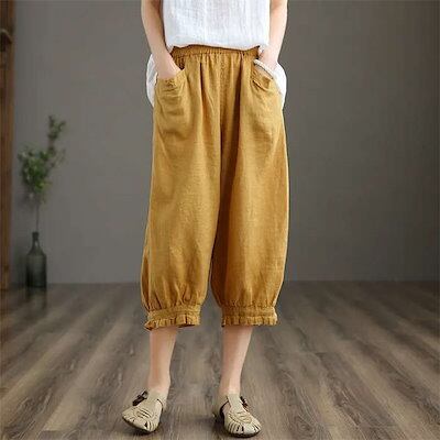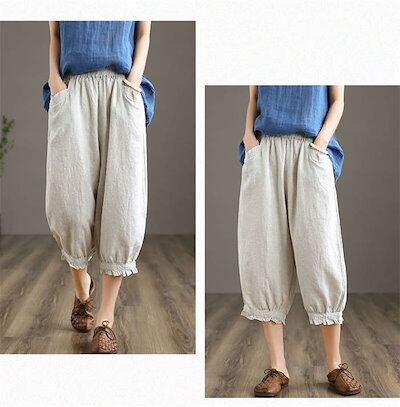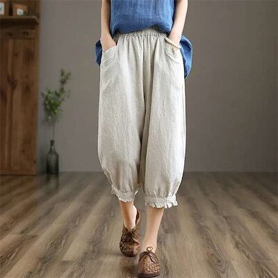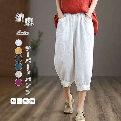 テーパードパンツ パンツ レディース サルエルパンツ 7分丈 春 夏 無地 クロップドパンツ ウエストゴム ギャザー タック リネン 麻 綿麻 リネンパンツ コットン シンプル ワイドパンツ ボトム