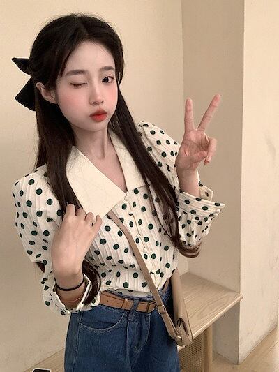 2024春夏トップス シャツ 長袖 バブル袖 ドット柄 Vネック 襟 ボタン 春 白 ホワイト かわいい キュート ガーリー 甘め おしゃれ 韓国ファッション レディース お出かけ