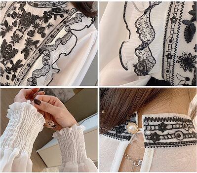 ブラウス レディース 可愛い 長袖 春秋 夏 トップス 刺繍 レース ボウタイブラウス 白 立ち襟 スタンドカラー フリル シワ オフィス シフォンブラウス シャツ 華やか 大きいサイズ インナー お