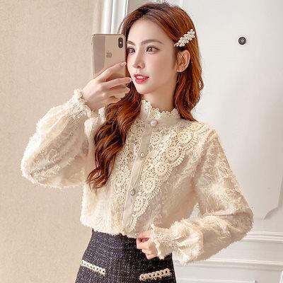 レースシャツ レディース 秋冬新作 ゆったり 立ち襟 長袖トップス レディースファッション 百掛け ブラウス ボトムシャツ