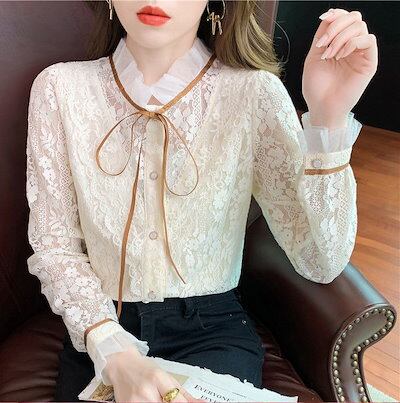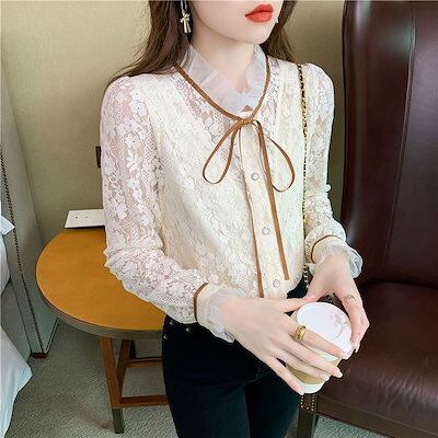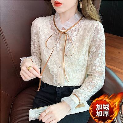 裏起毛/薄手 レース 立ち襟 シャツ レディース デザイン感 ブラウス 長袖トップス インナー 体型カバー