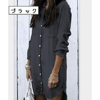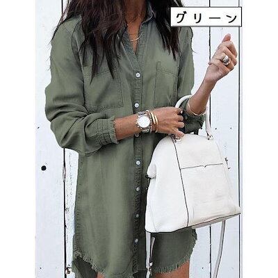 シャツ デニムシャツ デニムロングシャツ ロングシャツ レディース トップス 長袖 裾カット 前開き ポケット 丈長め 襟あり Vネック カジュアル