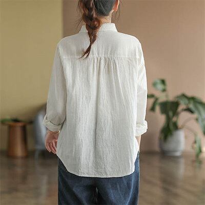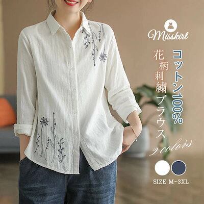 コットン100% シャツブラウス レディース 折り襟 シャツ ブラウス 長袖 トップス 羽織り ギャザー カジュアル 花柄 刺繍 無地 大きいサイズ 体型カバー ゆったり 通勤 シンプル 通気性 大き