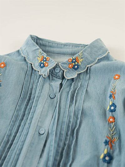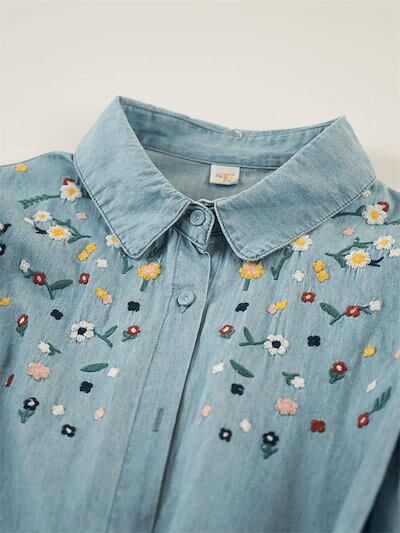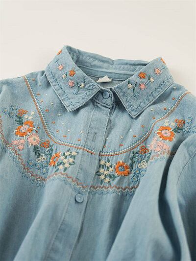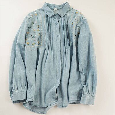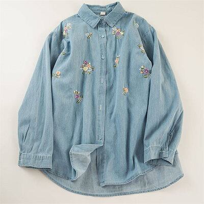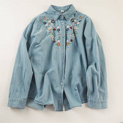 シャツ ブラウス デニム レディース 刺繍 花柄 長袖シャツ チュニック 春 デニムシャツ トップス シャツブラウス デニム 花柄シャツ デニムシャツ 春物 折り襟 刺繍 大きいサイズ ゆったり 柔ら