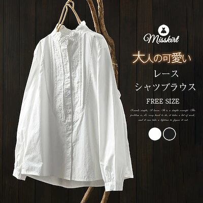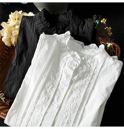 シャツ ブラウス レディース 春 夏 秋 長袖 トップス 前開き シャツブラウス フリル襟ブラウス 綿混 レース ブラウス シャツ コットン スタンドカラー 通勤 ビジネス オフィスカジュアル 冬 夏