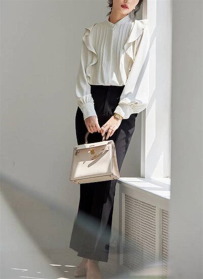 シャツ ブラウス レディース 新作 長袖 立ち襟 フリル 無地 デザイン感 トップス バルーン袖 ベーシック おしゃれ オフィス カジュアル シャツブラウス 前開き 重ね着 上品感 着回し 春 秋 大