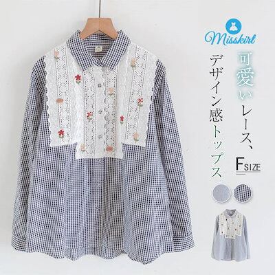 シャツ ブラウス 刺繍 新作 長袖 ストライプ チェック 花柄 レース 切り替え ガーゼ 綿 コットン 折り襟 シャツブラウス トップス レディース 前開き 春 秋 ゆったり 体型カバー 着?せ カジ