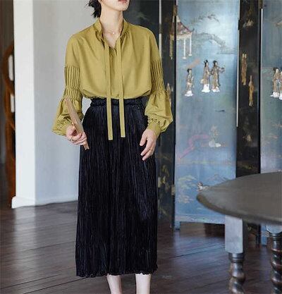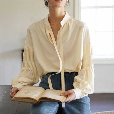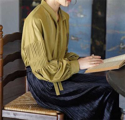 ブラウス シャツ レディース 春 秋 新作 トップス フォーマルブラウス バルーン袖 リボン スーツインナー 長袖 ギャザー カジュアル フォーマル 無地 ゆったり 立ち襟 大人 着痩せ エレガント