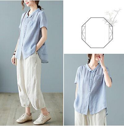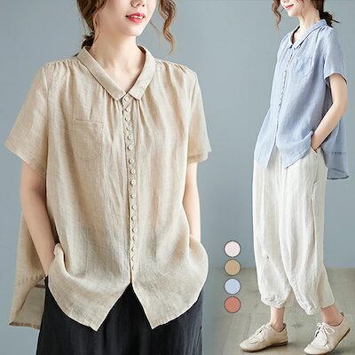 シャツ ブラウス レディース シャツブラウス 綿 麻 前開き 折り襟 半袖 ショート丈 シャツ 薄手 ポケット トップス ボタン 無地 秋 春 夏 カジュアル ゆったり 着痩せ 大人 大きいサイズ フ