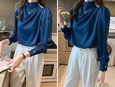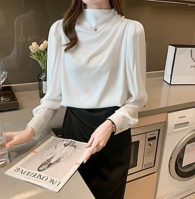 シャツ ワイシャツ ブラウス レディース ハイネック 無地 長袖 トップス 立ち襟 ボトルネック ボリュームスリーブ バルーン袖 着痩せ 体型カバー 大きいサイズ カジュアル フォーマル オフイス 通