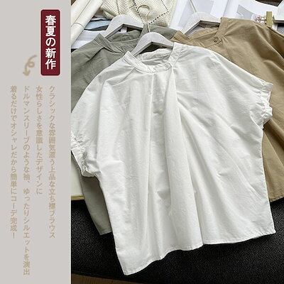 シャツブラウス 半袖 レディース 立ち襟 アシンメトリー ドルマンスリーブ クルーネック ボタン付き ボリューム袖 無地 ゆったり シンプル コットン混 通気 柔らか きれいめ おしゃれ オフィス 通