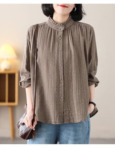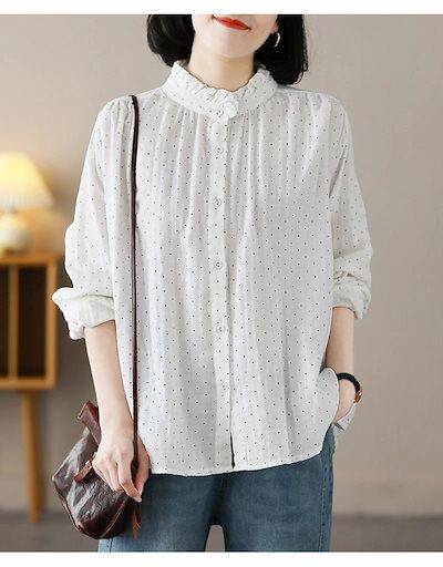 ブラウス レディース おしゃれ シャツ 長袖 立ち襟 シャツブラウス ドット柄 トップス ゆる 綿 コットンシャツ ふんわり 柔らかい 長袖シャツ バルーンスリーブ フリル 襟 水玉 前開き ボタン止