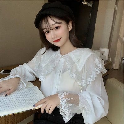 レディース ブラウス ガーリー ロリータファッション レース 大きな襟 長袖 リボン トップス カジュアル 可愛い フェミニン きれいめ 上品 エレガント おしゃれ お出かけ デイリー 普段着 ブ