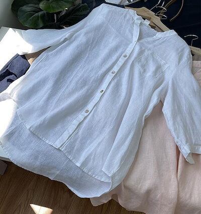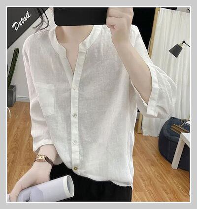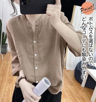 ブラウス シャツ リネン スキッパー レディース 大きいサイズ ゆったり 七分袖 リネンシャツ vネック 襟なし きれいめ おしゃれ 春 夏 秋 無地 シンプル 胸ポケット チ