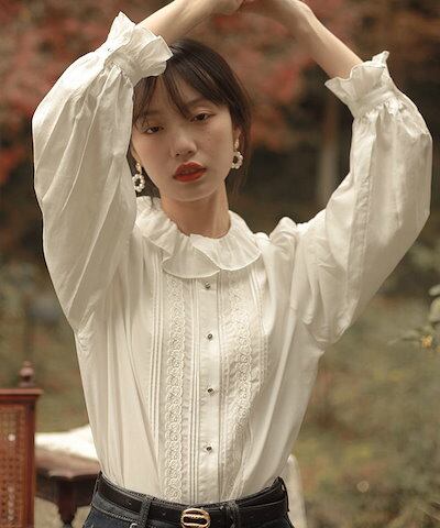 レディース ブラウス 長袖シャツ フリル ロングシャツ トップス 可愛い フェミニン ガーリー 大人ガーリー 大人可愛い 量産型 フリル襟 立ち襟 きれいめ 上品 エレガント おしゃれ お出かけ