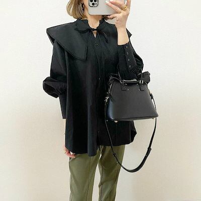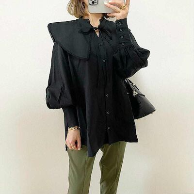 レディース ブラウス 大きい襟 ロングシャツ 長袖シャツ ロングスリーブ トップス カジュアル 大人可愛い レトロ フェミニン きれいめ ボリューム袖 おしゃれ お出かけ オフィス デイリー 普