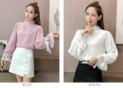 レディース ブラウス 立ち襟フリル キャンディスリーブ ロングシャツ 長袖 トップス カジュアル 可愛い フェミニン きれいめ 上品 エレガント おしゃれ お出かけ オフィス ピンク ホワイト S | Jeannede ジャンヌデ