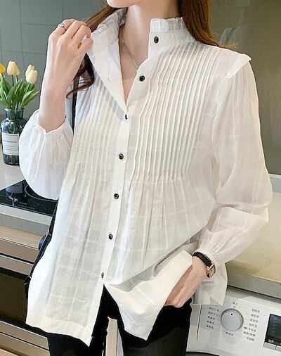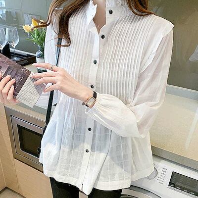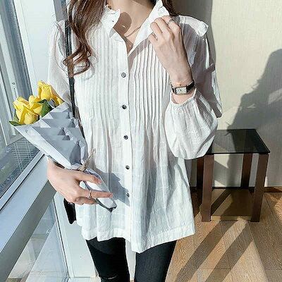 レディース ブラウス 立ち襟フリル 長袖シャツ ロングシャツ トップス カジュアル 大人可愛い フェミニン きれいめ 清潔感 爽やか 上品 おしゃれ お出かけ オフィス デイリー 普段着 ホワイ