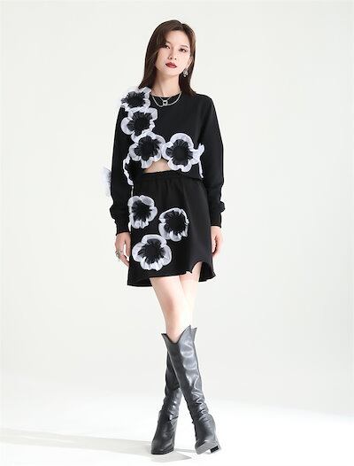 【J.Fashion】 花飾り ブラウス 秋冬 スウェット レディース 長袖 ドッキング トップス 関連商品は店で購入可能 メガ割