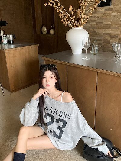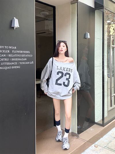 2024 秋冬トップス 長袖 肩見せ 数字 23 英語 ストライプ ゆったり 細見え 秋 グレー おしゃれ かわいい 韓国系ファッション レディースサイド お出かけ