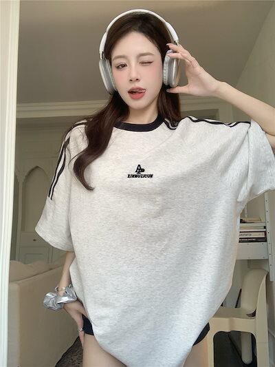 2024夏 韓国可愛い風トップス Tシャツ ロング丈 ファッション 半袖スリムフィット サイド ペイントシルエット ゆったり 休日レディースサイズ韓国系ネック黑おしゃれ カジュアル メンズライク T