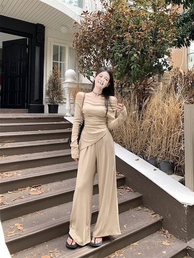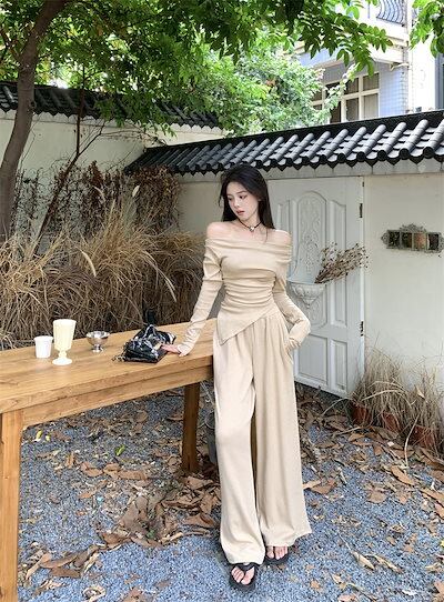 2024 秋冬 トップス 長袖 かわいいラウンドネック トレーナーTシャツ 肌見せ レディース ストレート韓国風ルーズゆったりカジュアルおしゃれサイズシルエットファッション系コーデ衣装上下セットアップ