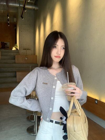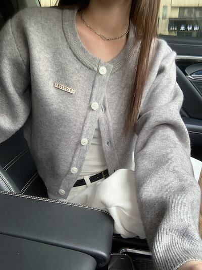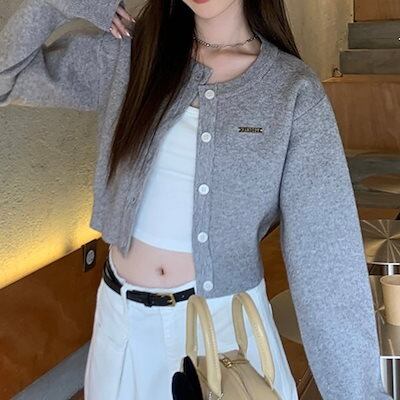 2024 秋冬トップス カーディガン ニット セーター ラウンドネック ボタン 長袖 丈短め 細見え 秋 グレー おしゃれ かわいい 韓国ファッション レディース お出かけ