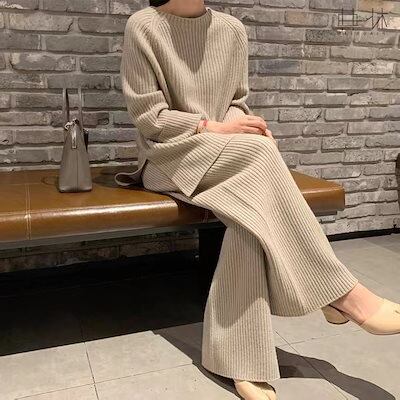 秋服セットアップ レディース 上下二点セット ニットセーター+ワイドパンツ カシミヤタッチ 快適スウェット上下セット 長袖立ち襟 ニットカーディガン 無地 シンプル 韓国ファッション クリスマスコフレ